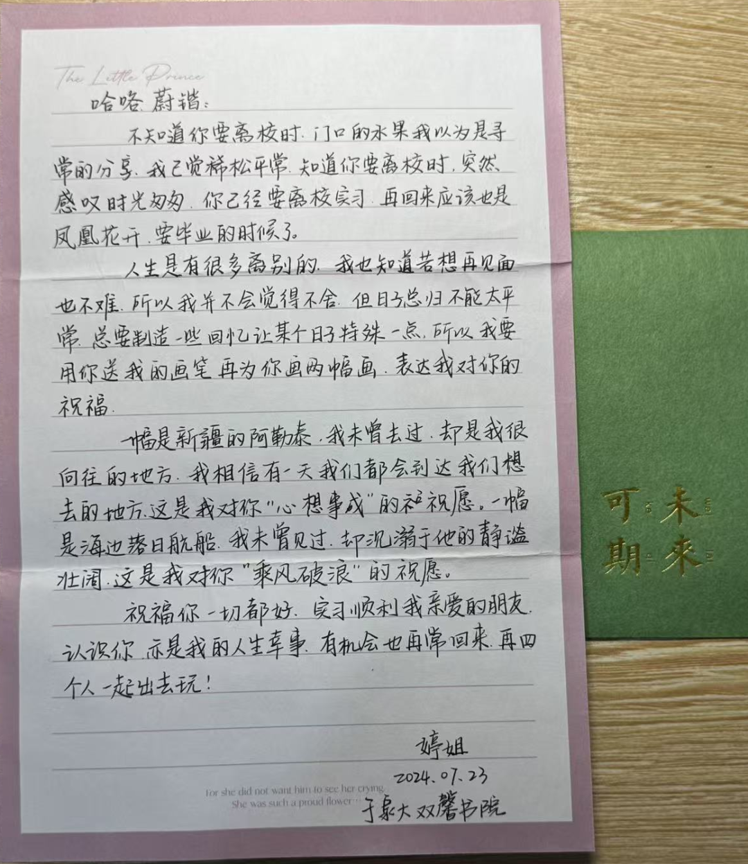 他最亏弱的是数学,报名进修周洋鑫的网课,将考研数学零根本课程刷了两遍。正在坚苦的数学面前,他每次都很疾苦,却一曲默默,“只需一学数学,我就很疾苦,我就会想吃甜的工具。”“最难受的时候,我心里解体,每天大把大把掉头发,都快支持不住了。”面临考研上各类挑和,他一咬牙挺过来。然而,正在离测验只剩一个多月时,他俄然得知专业课册本要改换的动静,人一会儿就解体了。那时,他正处于严重的练习中,还面对考研的压力,同时,又碰到一些家庭琐事的烦末路,为此心里很是焦灼。看到他解体,父母心里很难受,常常陪同他摆布。父母带他去郊外玩耍,让他沉浸正在那薰衣草、马鞭草的花海之中,他的表情一会儿放松下来。父母还给他做各类可口、甘旨的食物,有他最喜好的排骨酥、炸肉片。父母不只是物质上的支撑者,更是上的支柱。环节时辰,双馨书院教员潘婷婷帮他阐发,改换专业课书本这件事,是所有考研学子都要面临的坚苦,并激励他不要放弃。这位经常送给他画画、给他写信的潘教员,总会正在环节时辰激励他、支撑他。